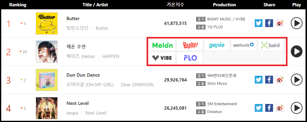 가온차트를 기준으로 'Dun Dun Dance'의 음원 시장 구조는 이와 같이 되어 있습니다.