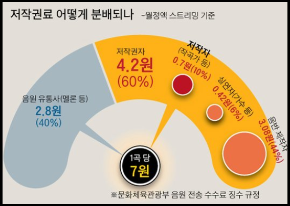 2018년 12월 정액제 스트리밍(음원 전송) 서비스를 기준으로 한 곡당 발생하는 수익은 약 7원입니다. 문화체육관광부가 정한 비율로 7원을 나누면 다음과 같습니다. / 유통사와 저작권자의 비율이 소폭 바뀔 수 있음. (참고: 중앙일보 2018.12.15)