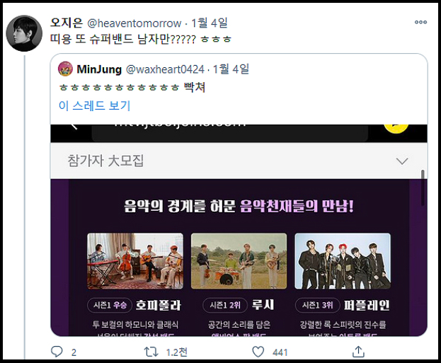 슈퍼밴드1의 성공 덕분에 슈퍼밴드2도 기대하는 시청자들이 많습니다. 현대 사회의 가장 예민한 부분인 성별 논란이 있었지만 즉각 수정하여 더 다양한 뮤지션들을 볼 수 있게 되어 다행입니다. 슈퍼밴드2의 흥행도 기원하며 이번 시즌에 나올 뮤지션도 기대하겠습니다.